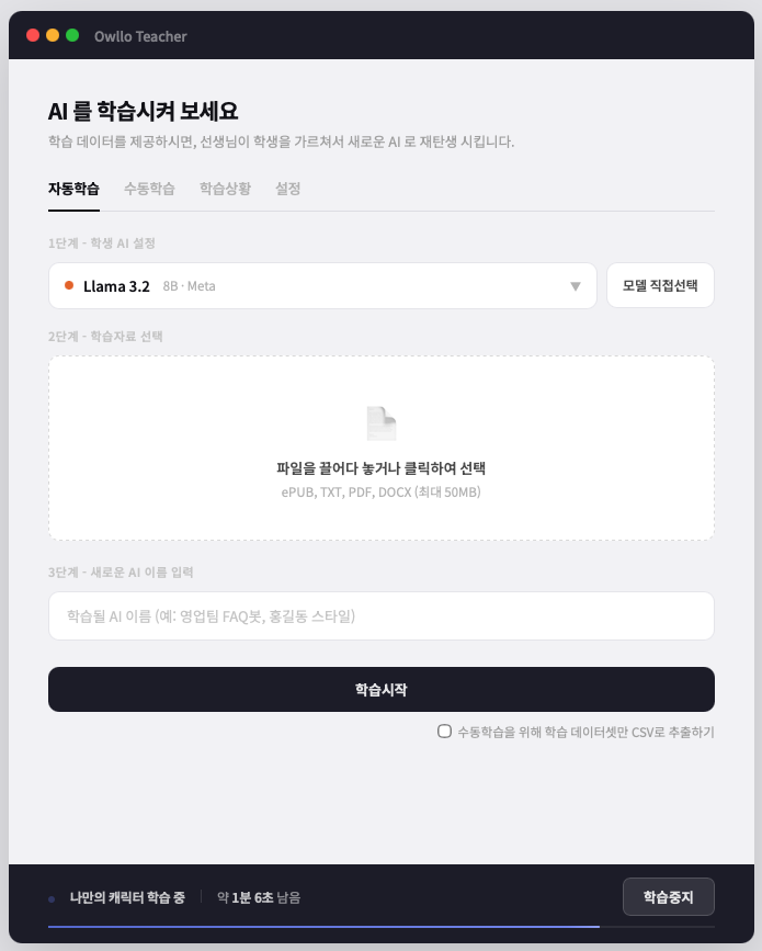 아울로 티쳐는 그 과정을 파일 올리기, 이름 짓기, 학습 시작 버튼 누르기로 줄였습니다. 내 컴퓨터에서, 내 데이터로, 나만의 AI를 만드는 경험. 이제 누구나 할 수 있습니다.