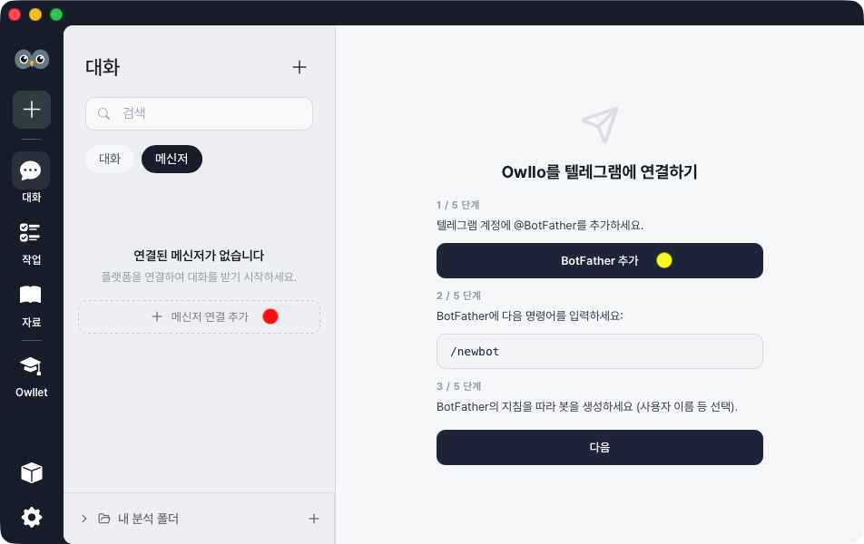 첫 출시 버전에서는 텔레그램 메신저를 지원합니다. 텔레그램을 선택한 이유는 다른 메신저에 비해 봇 API가 잘 갖춰져 있고, 빠르고 안정적이며, 전 세계적으로 많은 분들이 사용하고 계시기 때문이에요. WhatsApp, Discord 등 다른 메신저 지원은 4월 중순 업데이트를 통해 순차적으로 추가될 예정입니다.