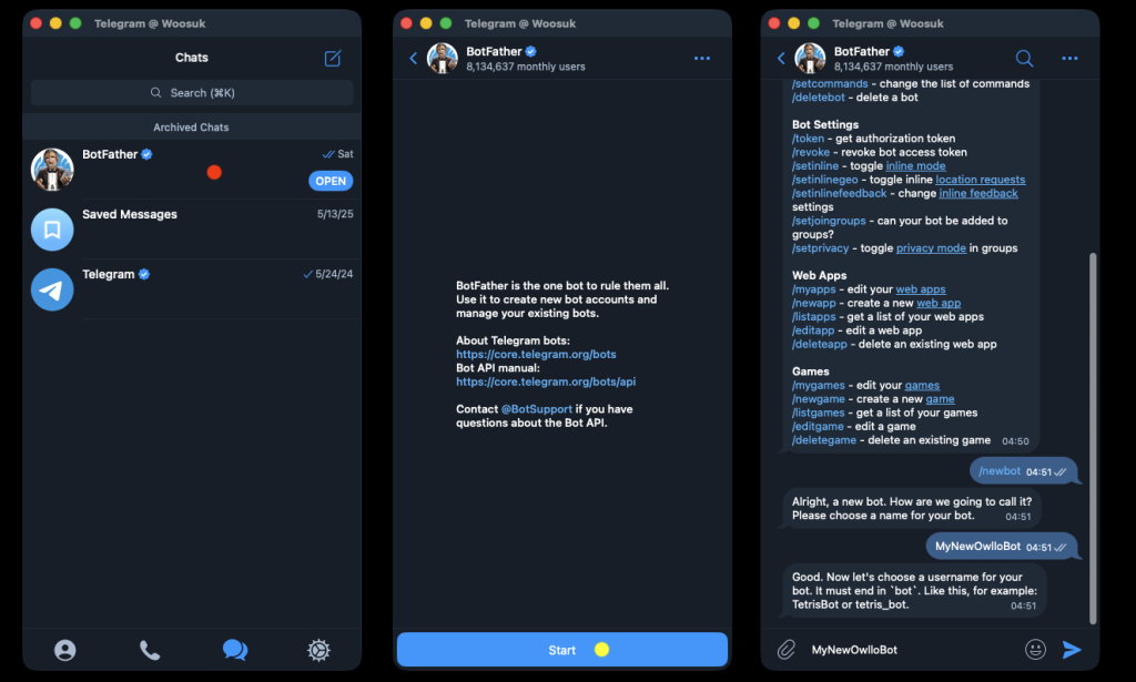 3. 그러면 봇 이름을 정하라고 하는데, 봇 이름은 끝이 “bot”으로 끝나야 합니다. 만약 owllo로 이름을 정하고 싶으면, “owllobot” 으로 입력하고 보내기(엔터)를 하시면 됩니다.