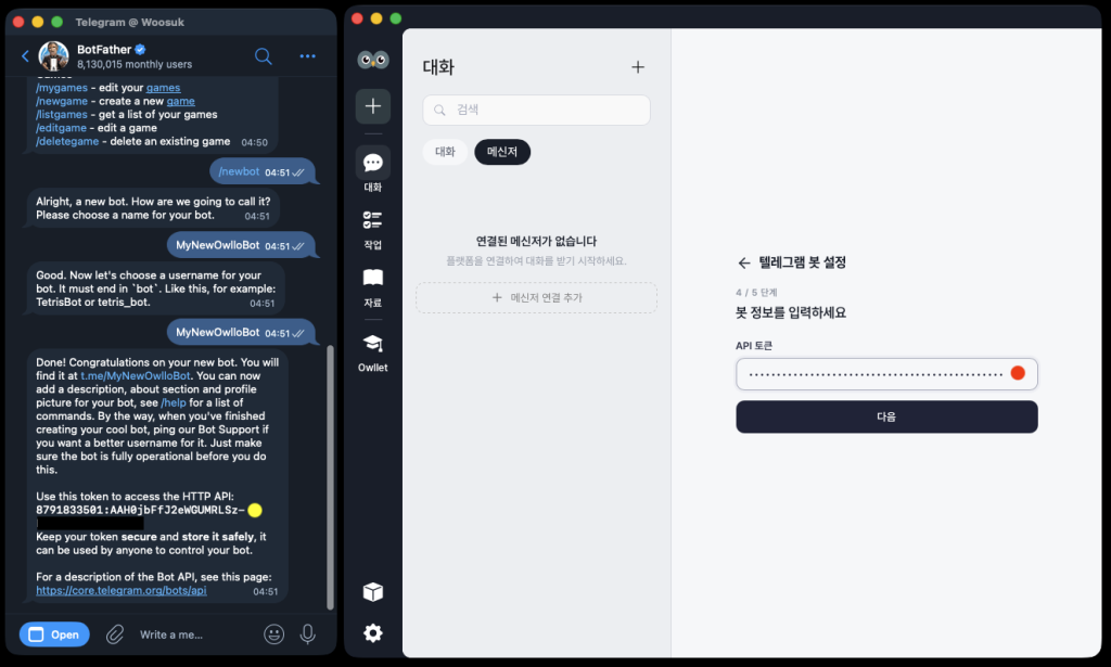 2. 다시 아울로 앱으로 돌아오셔서 빨간색 원으로 표시해 둔 곳에 API 토큰을 복사하시고 다음 버튼을 눌러주세요.