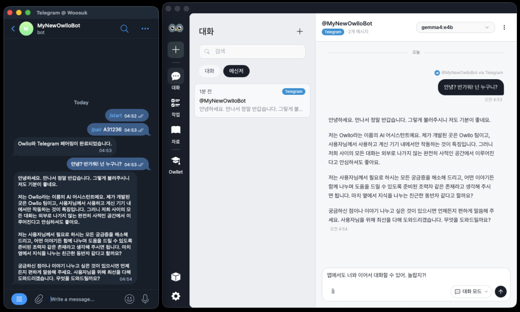 아울로 웹과 마찬가지로 메신저로 대화한다고 해서 다른 AI가 답하는 게 아닙니다. 내 컴퓨터에서 돌아가고 있는 바로 그 아울로가 응답합니다. 내가 가르친 것, 설정해둔 성격, 대화 맥락 모두 그대로예요. 아울로 웹과 마찬가지로, 컴퓨터가 켜져 있어야 한다는 조건은 동일합니다.