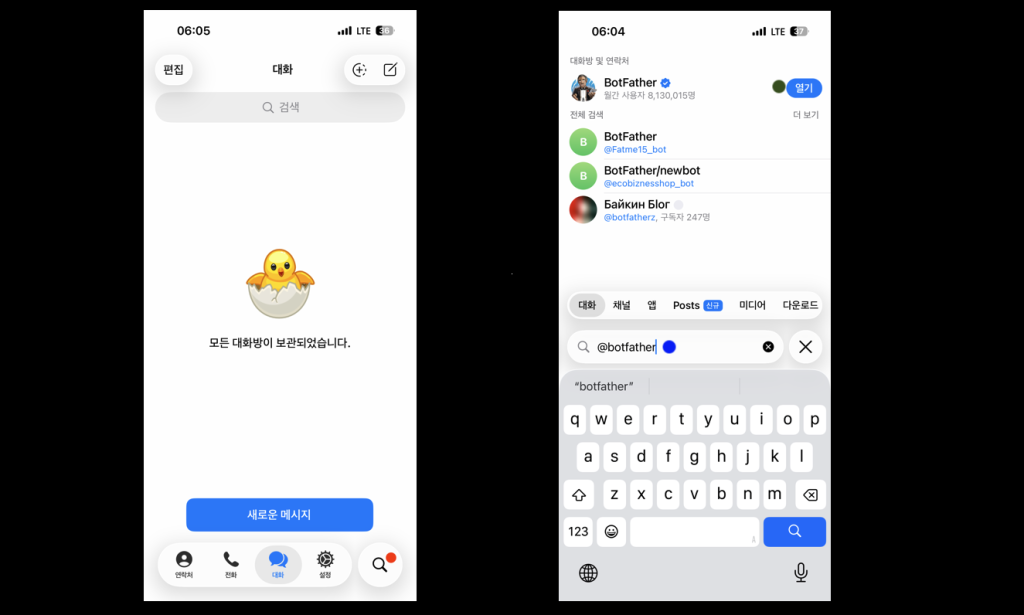 4. 그러면 녹색 원으로 표시된 것 처럼 상단에 BotFather 대화방이 검색이 되는데 “열기” 버튼을 터치합니다.